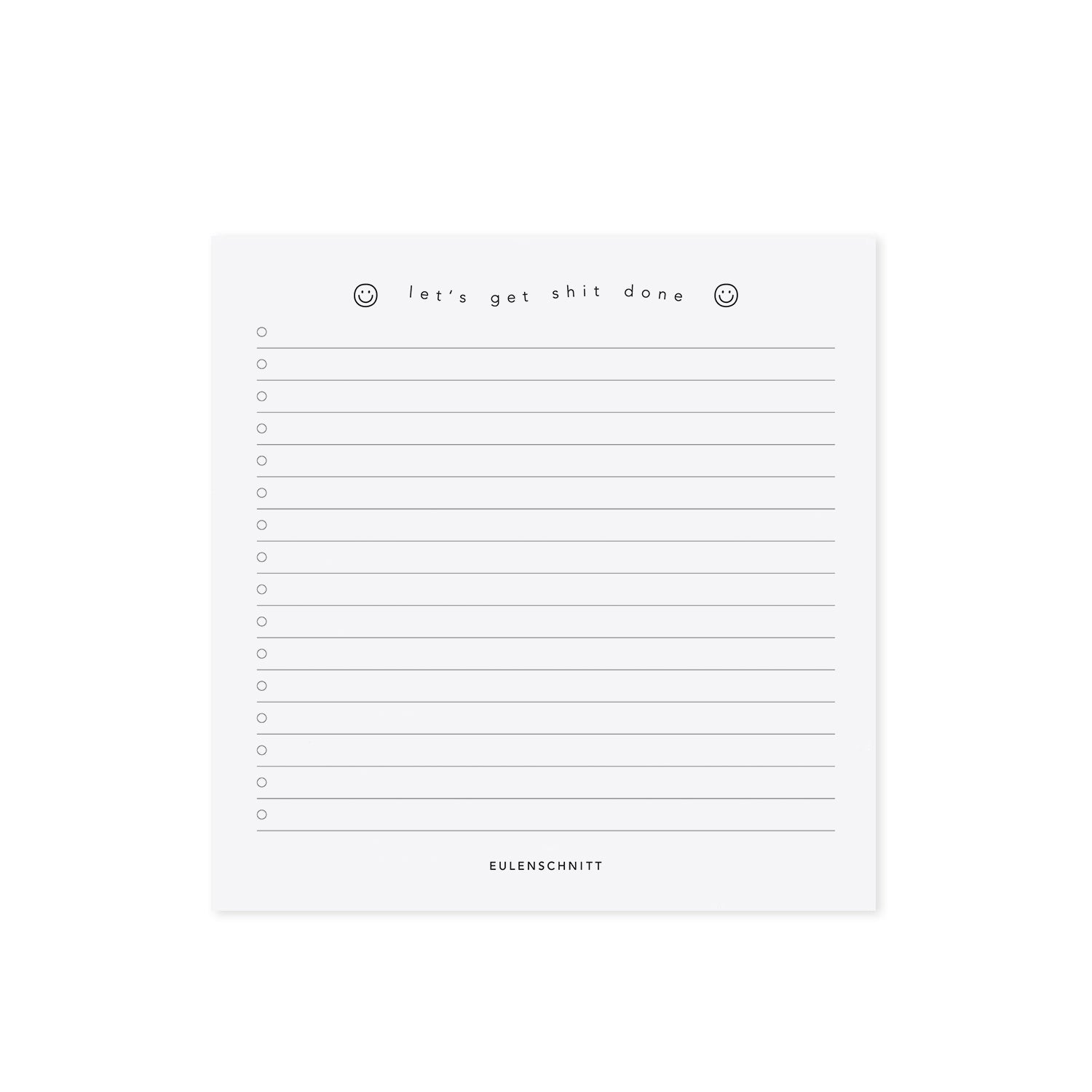 Du liebst es, deine Gedanken zu ordnen und To-Do-Listen zu schreiben? Dann ist der Notizblock „Let’s get shit done“ von Eulenschnitt genau das Richtige für dich! Mit seinem handlichen, quadratischen Format (15 x 15 cm) bietet er dir genügend Platz für deine täglichen Aufgaben, Gedanken, Notizen oder auch kreative Ideen.