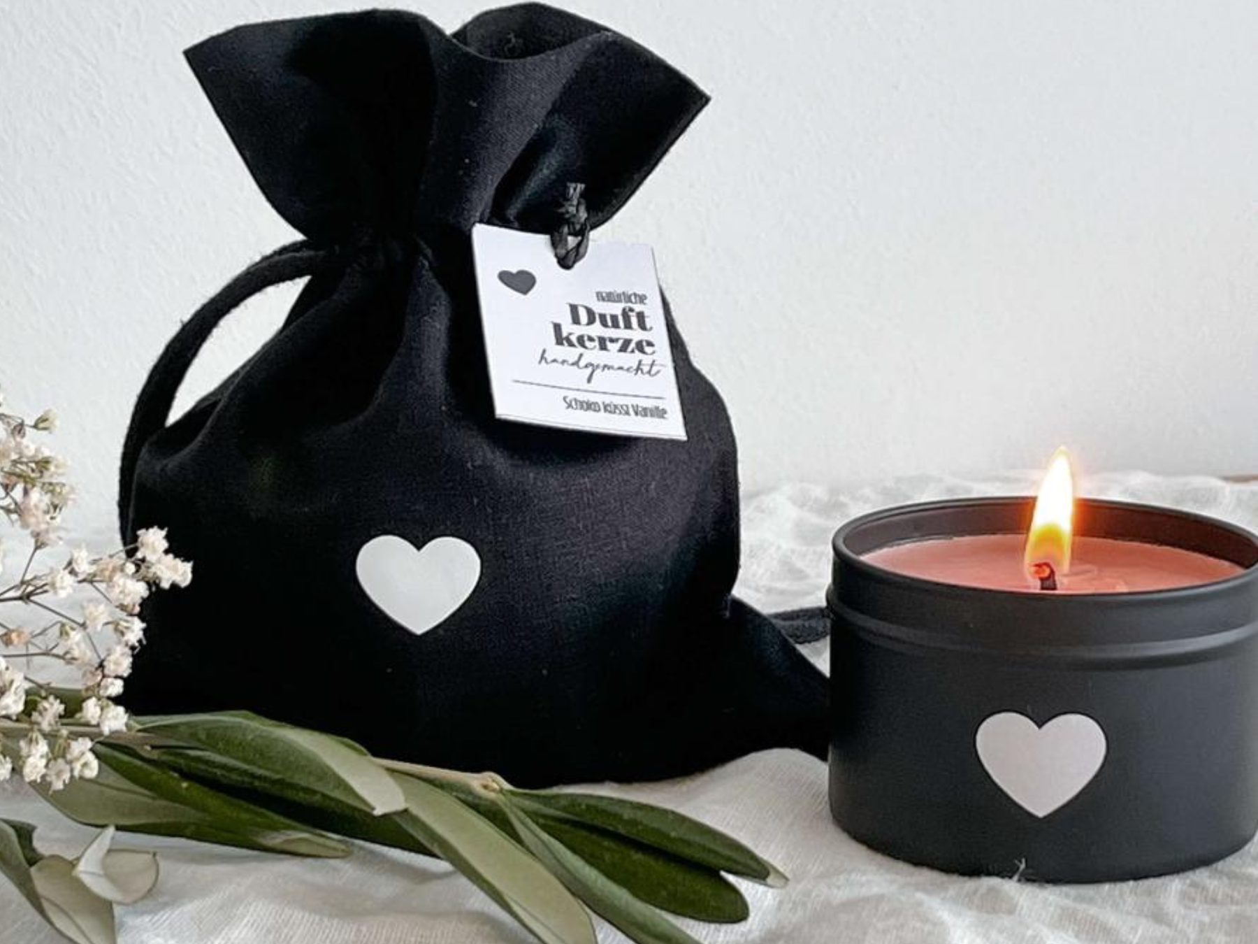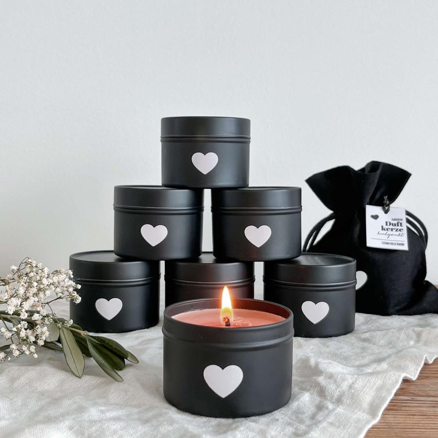 Die Kerze steckt in einer edlen schwarzen Metalldose. Das beige Wachs trägt ein feines Papierherz – ein liebevolles Detail, das sofort ins Auge fällt.