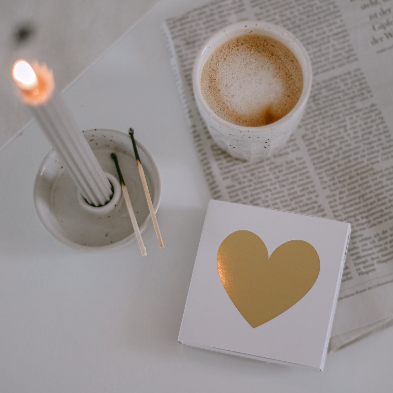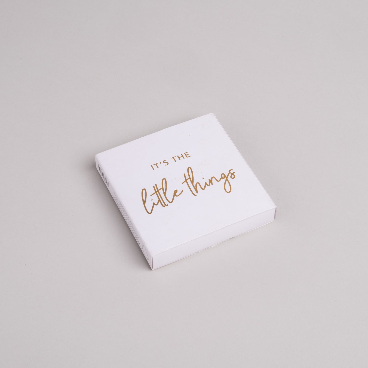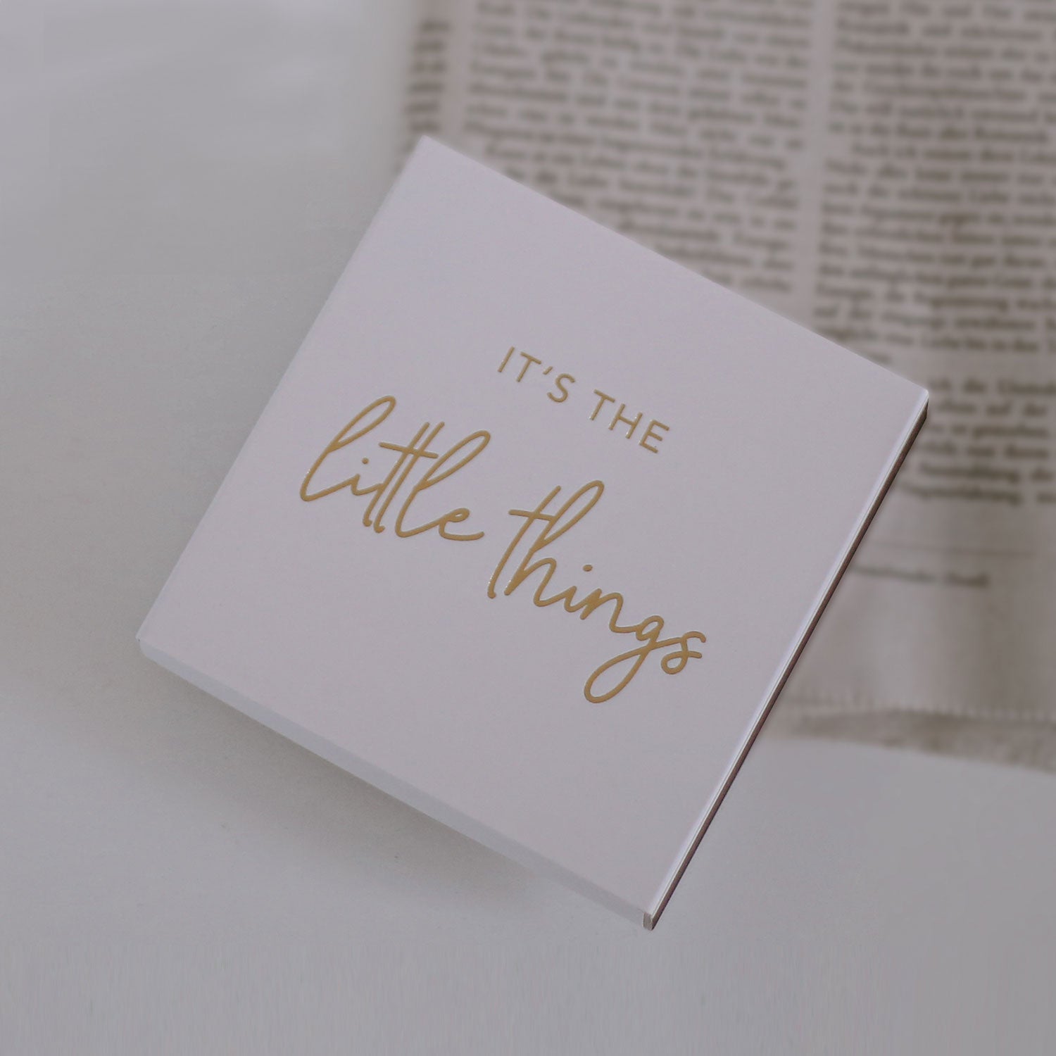 🌟 Die elegante Streichholzschachtel ist auf der einen Seite mit einem großen goldenen Herz veredelt, auf der anderen mit dem Spruch „It’s the little things“ – beide mit edler Heißfolienprägung. Ein schönes Statement für mehr Wertschätzung im Alltag.