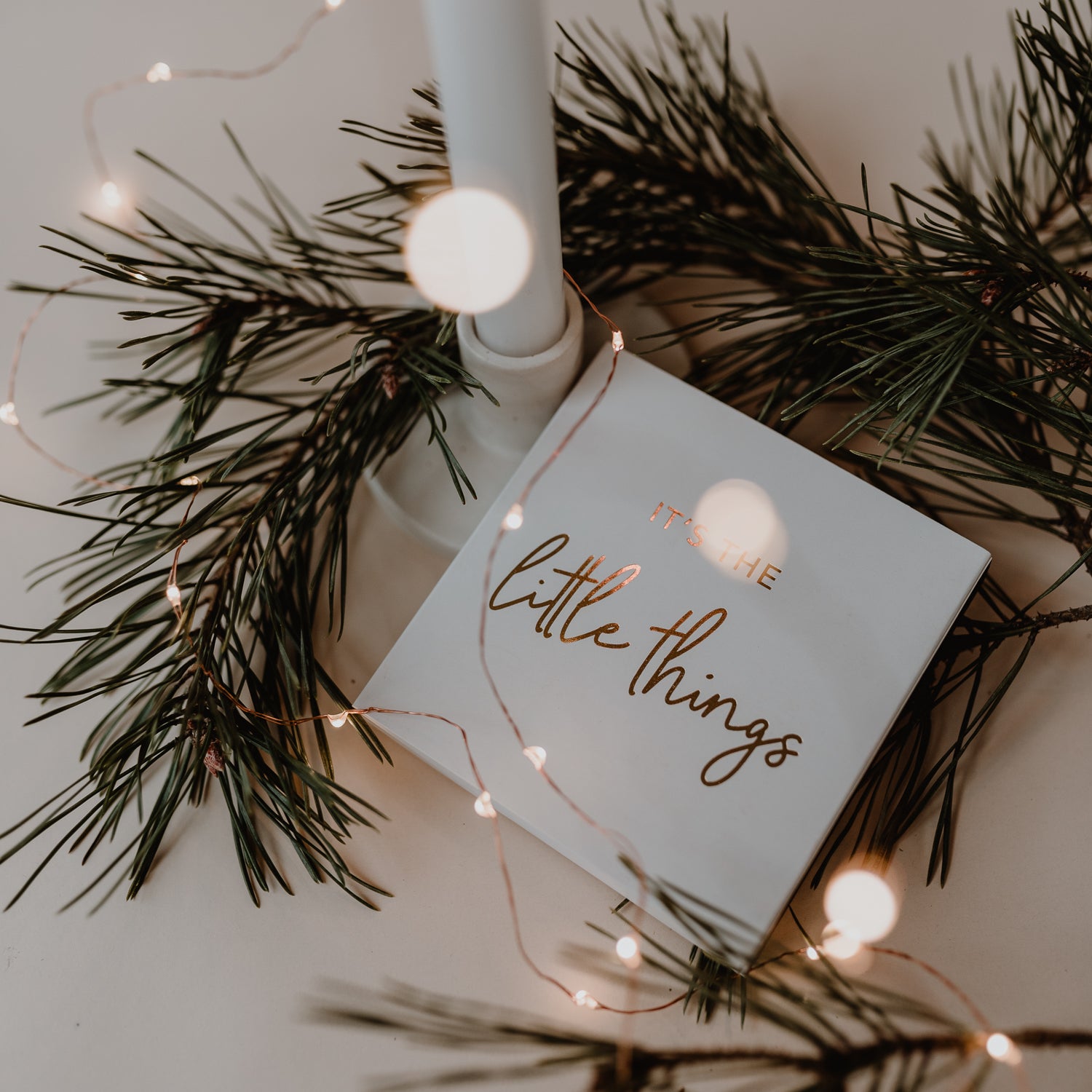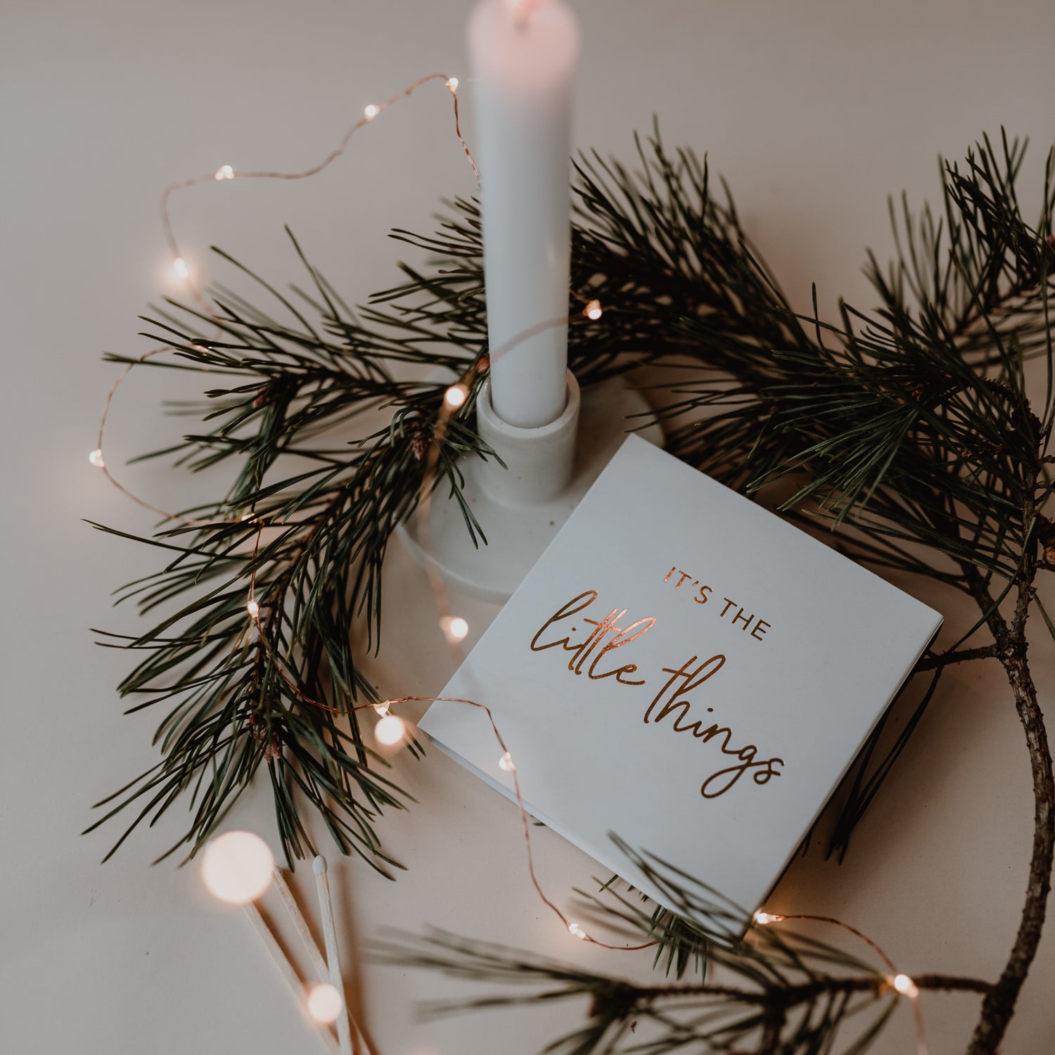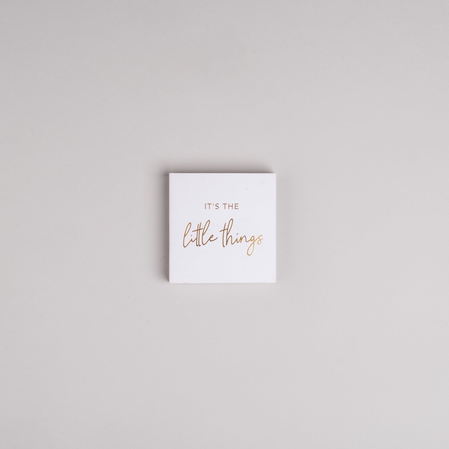 🌟 Die elegante Streichholzschachtel ist auf der einen Seite mit einem großen goldenen Herz veredelt, auf der anderen mit dem Spruch „It’s the little things“ – beide mit edler Heißfolienprägung. Ein schönes Statement für mehr Wertschätzung im Alltag.